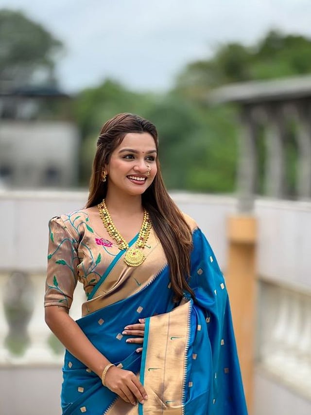 गोल्डन ब्लाउज पैठणीच्या झरी वर्कला मॅच होतो आणि साडीला एलिगंट आणि श्रीमंती लूक देतो.