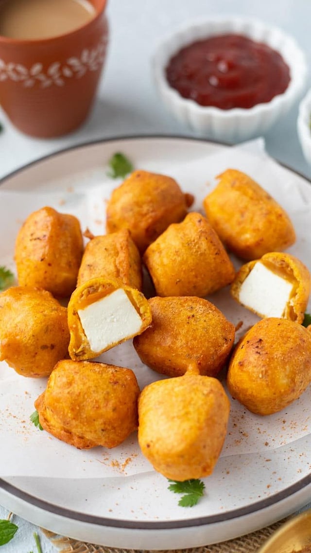 गरमागरम पनीर पकोडे टोमॅटो सॉससोबत खा.