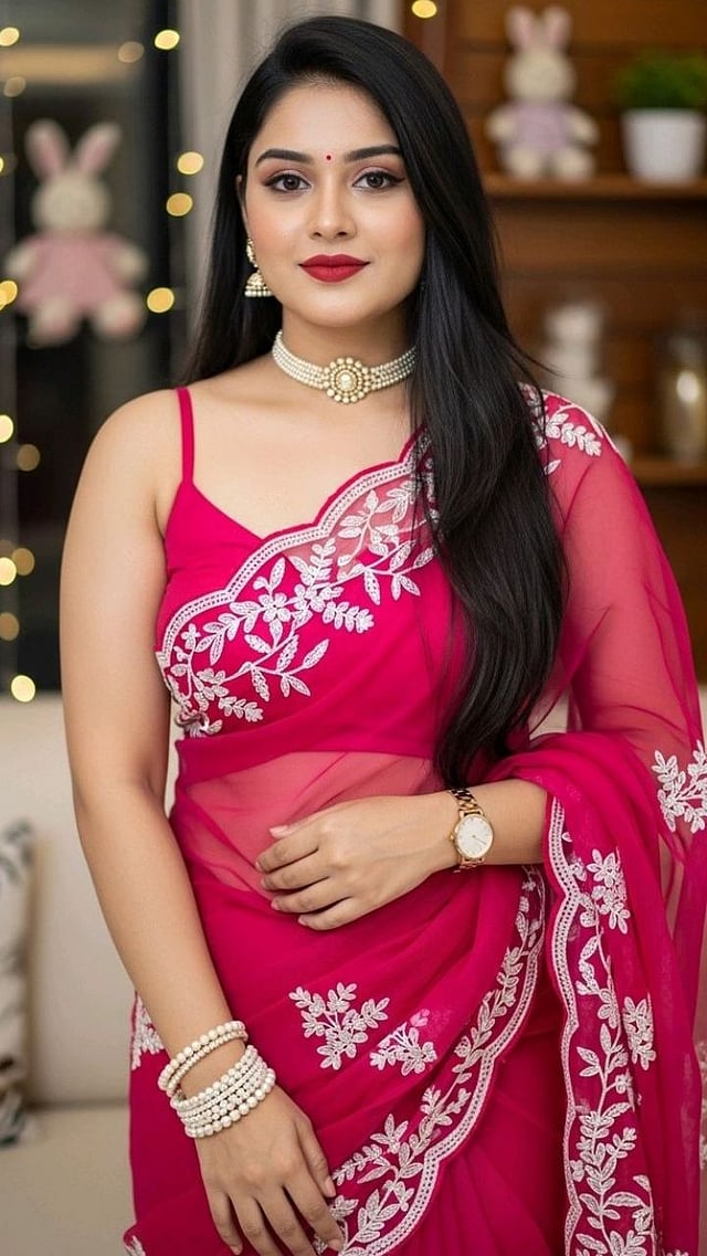 गुलाबी साडीवर चंदेरी किंवा राखाडी रंगाचा ब्लाऊज खूपच क्लासी आणि स्टायलिश दिसतो. हा लूक संध्याकाळच्या पार्टीसाठी परफेक्ट आहे