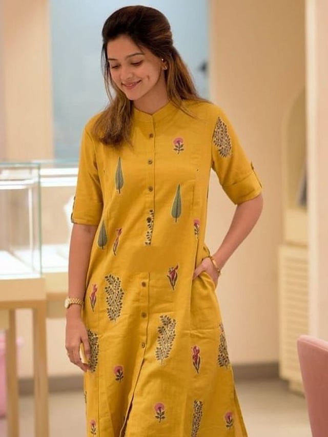 येलो, ब्लू अशा रंगांचे कुर्ता सेट्स, अनारकली कट आणि व्ह-नेक डिझाइन उत्तम दिसते.