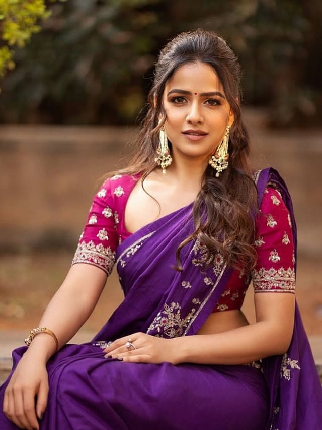 जांभळ्या साडीवर ब्लॅक ब्लाऊज नेहमीच स्टायलिश आणि सेफ चॉईस मानला जातो. मॉडर्न आणि बोल्ड लुकसाठी हा उत्तम कॉम्बो आहे.