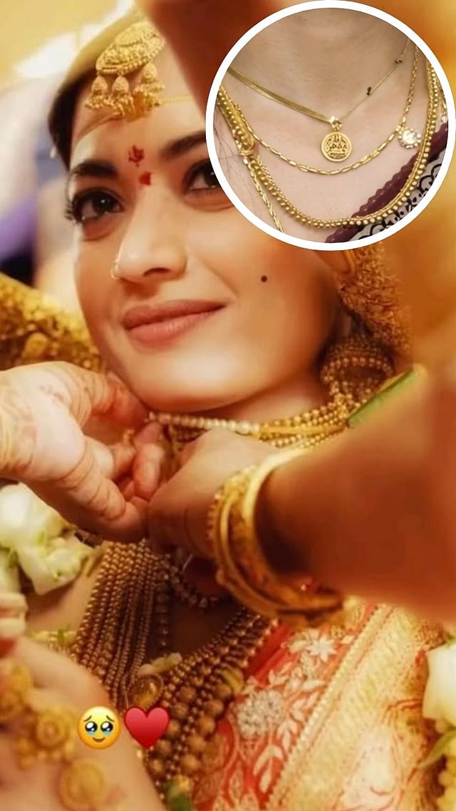 रश्मिकाच्या मंगळसूत्रात सोन्याच्या बारीक चैनमध्ये एका बाजूला काळे मणी गुंफलेले आहेत मंगळसूत्राच्या मध्यभागी सोन्याचे 'लक्ष्मी' पदक आहे, जे समृद्धी आणि आशीर्वादाचे प्रतीक मानले जाते. म्हणून हे मंगळसूत्र सध्या चर्चेत राहिलं आहे.