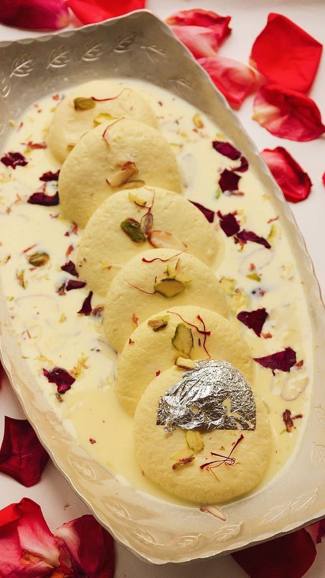 थंडगार रसमलाई बदाम-पिस्त्याच्या कापांसह सजवून सर्व्ह करा. सण-उत्सव किंवा खास पाहुण्यांसाठी परिपूर्ण गोड पदार्थ!