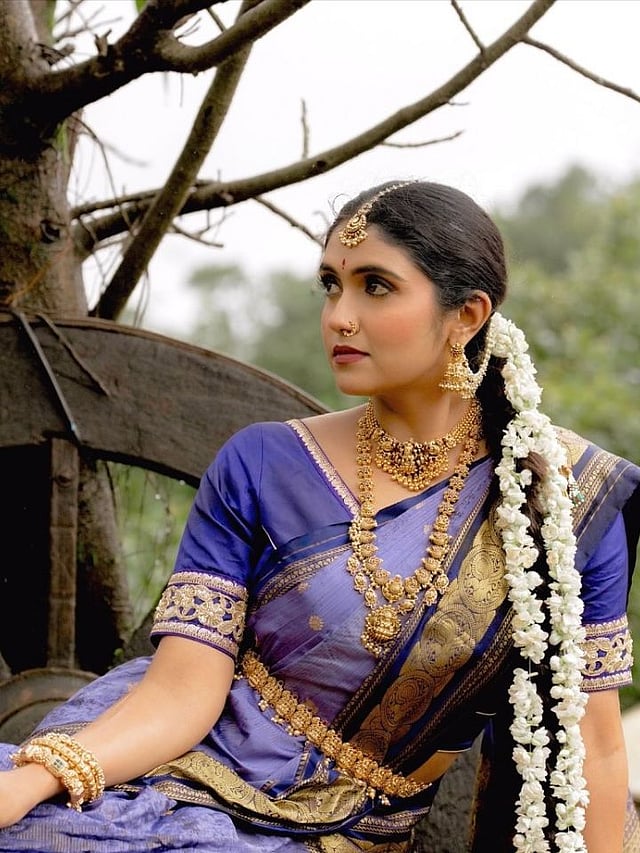 रिंकून निळ्या रंगाची साडी परिधान केली आहे. ज्यामध्ये तीचा लूक अधिकच उठून दिसतो आहे.