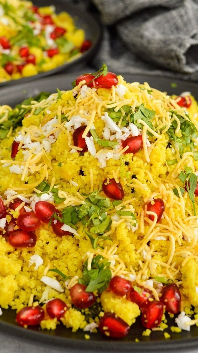 शेवटी यात वरून चटपटीत शेव, हिरवीगार कोथिंबीर आणि डाळिंबाचे दाणे टाकून शेव खमणीचा आस्वाद घ्या.