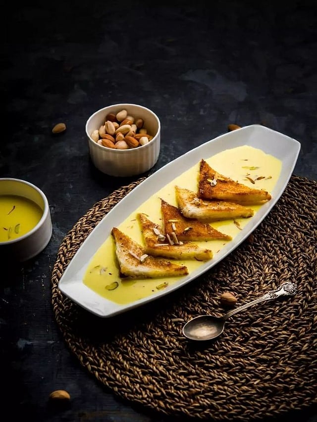 प्लेटमध्ये भिजवलेले ब्रेड ठेवा. त्यावर आटवलेलं दूध ओता आणि वरून चिरलेले बदाम, काजू व पिस्ते पेरा