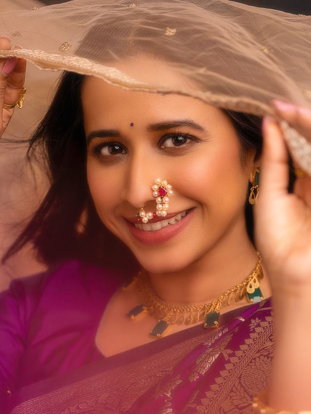 श्रेया बुगडेने जांभळ्या रंगाची बनारसी नऊवारी साडी नेसली आहे.