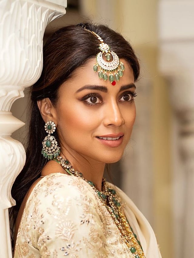श्रियाने या लूकसाठी ग्रिन कलरची ज्वेलरी निवडली आहे. यामध्ये पूर्ण व्हाइट स्टोन सुद्धा आहेत.