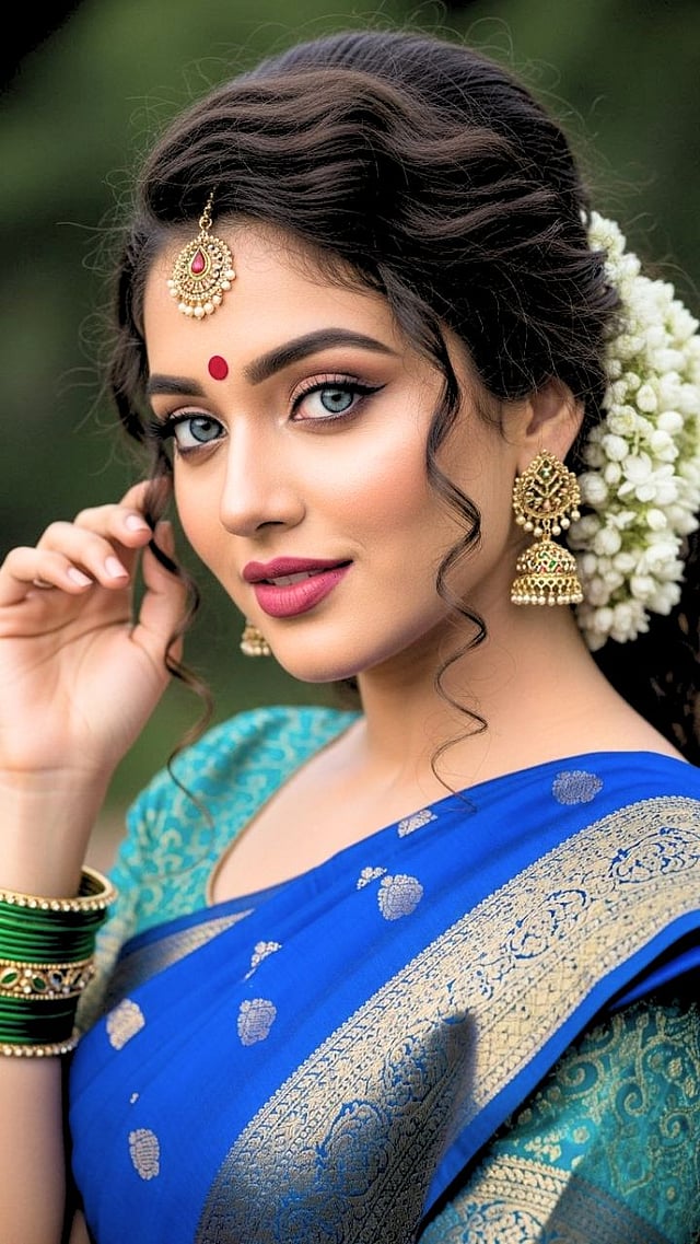 रॉयल ब्ल्यू किंवा नेव्ही ब्ल्यू सिल्क साडीवर कॉपर, सिल्वर किंवा ऑफ-व्हाइट ब्लाऊज उठून दिसतो.