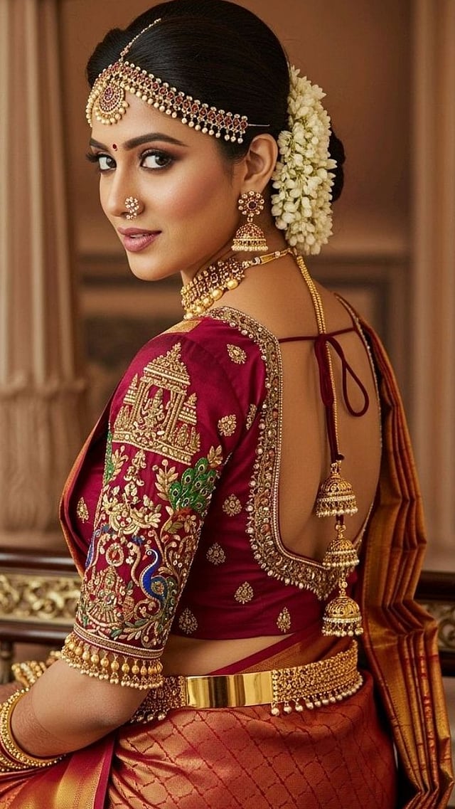 पारंपारिक साड्यांसाठी, विशेषतः पैठणी किंवा कांजीवरम साडीवर तुम्ही 'आरी' वर्क किंवा 'मॅगम' वर्क कोपरपर्यंत बाह्या हा पॅटर्न निवडू शकता.