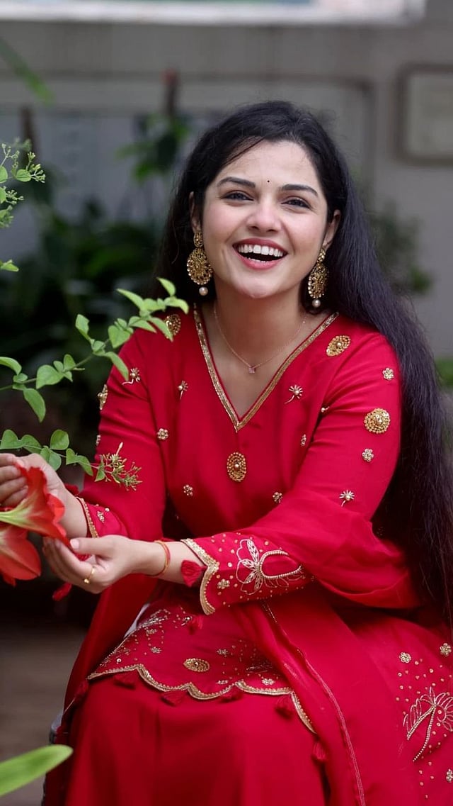 आर्याने लाल रंगाचा सुंदर सूट परिधान केला आहे, ज्यावर गोल्डन रंगाची सुंदर डिझायन आहे.