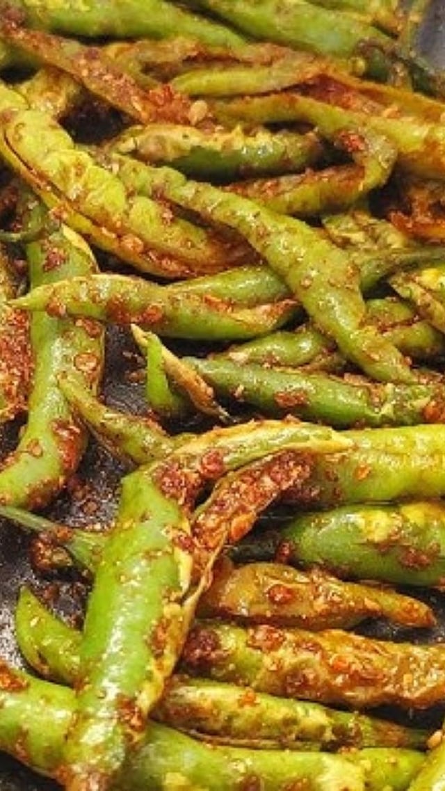 मिरच्या शिजल्यावर वरून लाल तिखट आणि थोडी साखर घाला. साखरेमुळे चव संतुलित होते आणि झणझणीतपणाला छान गोडसर टच येतो.