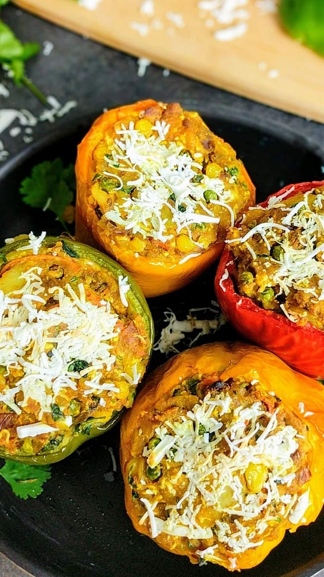भरलेली शिमला मिरची बनवण्यासाठी शिमला मिरची, उकडलेले बटाटे, पनीर, कांदा, गाजर आणि तेल इत्यादी साहित्य लागते.