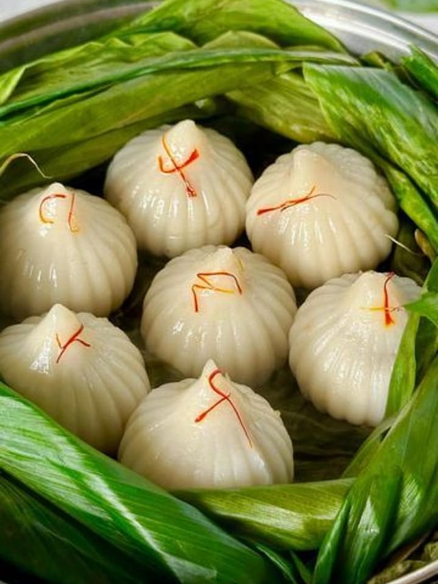 भरलेल्या मोदकांना १०–१५ मिनिटे वाफेत शिजवायला ठेवतात; शिजल्यानंतर त्यावर तूपाची धार सोडून गरम गरम सर्व्ह करा.