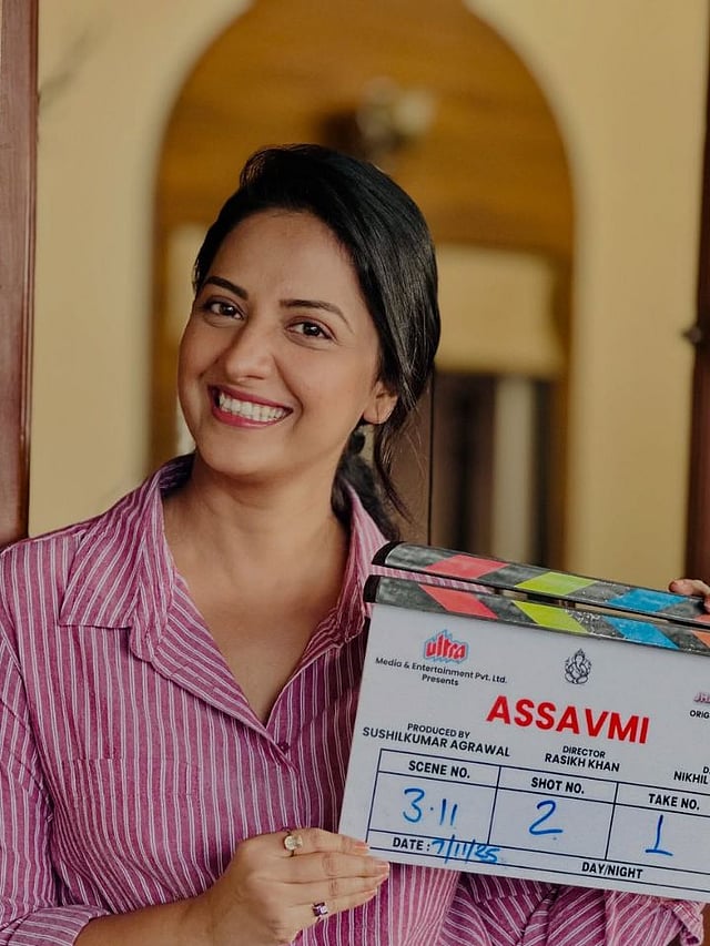 तेजश्रीच्या चित्रपटाचं नाव असवामी असं आहे. या चित्रपटाच्या नावाची पाटी हातात घेऊन तिने फोटो पोस्ट केले आहेत.