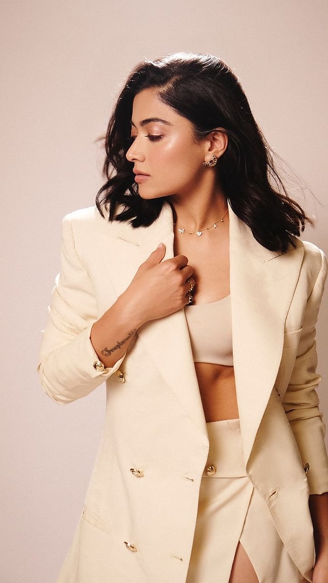 रश्मिकाने क्रिम कलरचा टॉप, स्कर्ट आणि त्यावर क्रिम कलरचे जॅकेट असा लूक केला आहे.