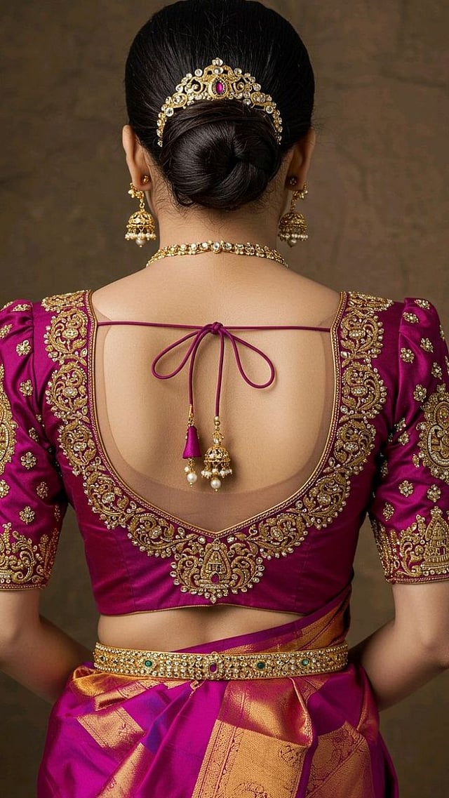 ब्लाऊजच्या पाठीवर दागिन्यांसारख्या सोन्याच्या चेन किंवा मोत्याच्या माळा जोडलेल्या असतात. हे डिझाइन प्रामुख्याने रिसेप्शनच्या साड्यांवर किंवा लेहेंग्यावर उठून दिसते.