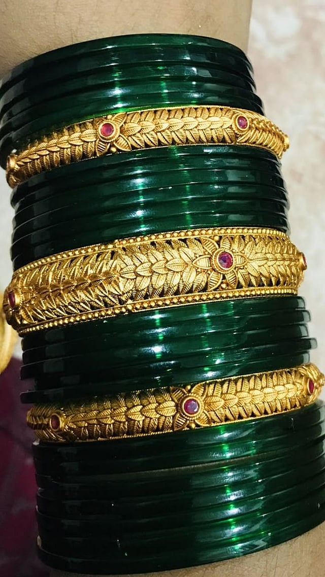 सणासुदीला महिला हिरव्या काचेच्या बांगड्या परिधान करतात साध्या गडद हिरव्या रंगाच्या बांगड्या कोणत्याही साडीवर उठून दिसतात.
