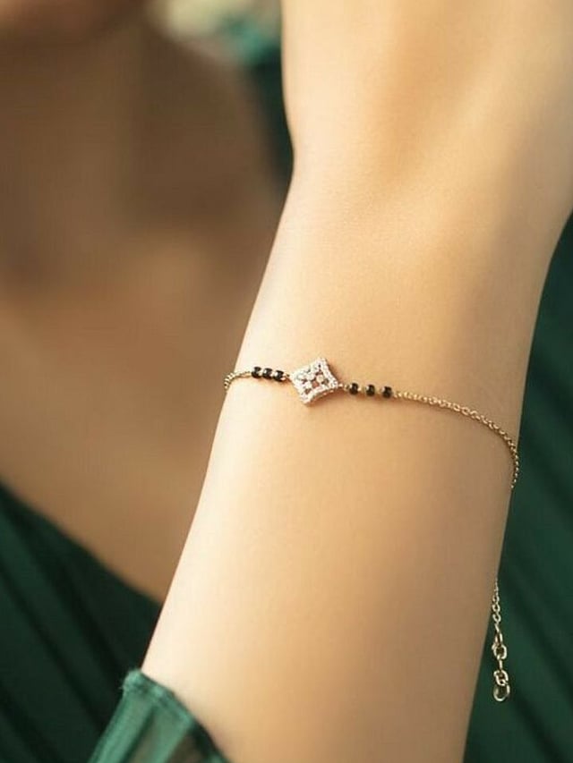 मधोमध छोटा डायमंड किंवा डायमंड स्टडेड डिझाइन असलेले ब्रेसलेट मंगळसूत्र खास प्रसंगांसाठी आकर्षक ठरते.