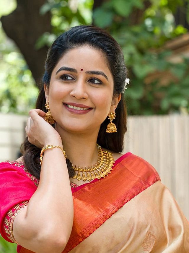 वैदेहीने छान कांचीवरम साडी नेसली आहे. त्यावर लाल रंगाचा काठ आहे.