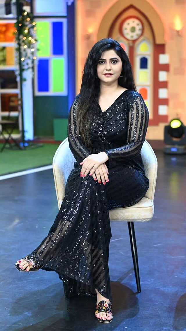 वीणाने ग्लॉसी लूकमध्ये काळ्या रंगाचा शिमरी गाऊन परिधान केला आहे.