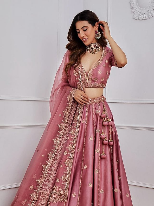 मिरर वर्क असलेला डार्क कलर लहंगा आणि हलका दुपट्टा हा नजरेत भरणारा पर्याय आहे. तो नृत्य कार्यक्रम किंवा साखरपुड्यासाठी योग्य ठरतो.