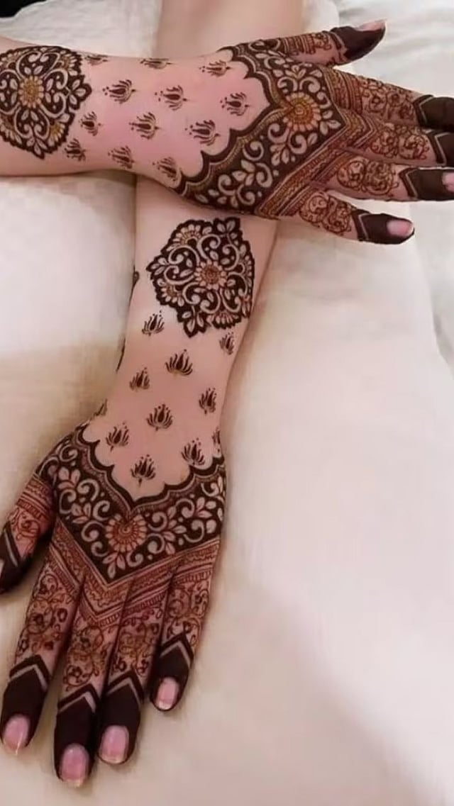 हाताच्या मागच्या भागावरही मेहंदी काढायची असेल तर ही डिझाईन चांगली आहे. ही कमळाची डिझाइनमध्ये सर्व बारकावे बोटांवर केंद्रित केले आहेत, ज्यामुळे संपूर्ण हातावर एक सुंदर कमळाची नक्षी तयार होते.