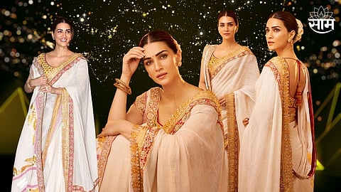 यावेळी क्रितीने घातलेल्या साडीची देखील मोठी चर्चा होत आहे. अभिनेत्रीने यावेळी ट्रेडीश्नल लूक ठेवलं होतं. सफेद रागंची साडी त्यावर गुलाबी आणि सोनेरी रंगाची नक्षी असलेली किनार होती. तसेच लूक पूर्ण करण्यासाठी तिने यावर सोनेरी रंगाचा ब्लाउज परिधान केला होता. त्यामुळे सध्या सोशल मीडियावर क्रितीच्या या सोनेरी साडीची चांगलीच चर्चा रंगली आहे.