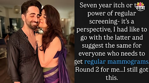ताहिराने तिच्या पोस्टमध्ये लिहिले, "सात वर्षांच्या नियमित तपासणीनंतर हे उघडकीस आले आहे. दुसऱ्या दृष्टिकोनातून, मी तुम्हाला वेळोवेळी मॅमोग्राम करत राहण्याचा सल्ला देऊ इच्छितो. ही माझी दुसरी फेरी आहे, मी पुन्हा एकदा मॅमोग्राम केले आहे." तर, ताहिराने या पोस्टच्या कॅप्शनमध्ये लिहिले, "जेव्हा आयुष्य तुम्हाला लिंबू देते, तेव्हा लिंबूपाणी बनवा. जेव्हा आयुष्य पुन्हा तुमच्यावर लिंबू फेकते, तेव्हा त्यांना शांतपणे तुमच्या आवडत्या काळ्या खट्टामध्ये त्याला मिक्स करा आणि सर्व चांगल्या हेतूंनी त्याचा आस्वाद घ्या. कारण तुम्हाला माहित आहे की तुम्ही पुन्हा एकदा तुमचे सर्वोत्तम प्रयत्न कराल."