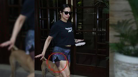 मलायका मुंबईतील एका सलून बाहेर स्पॉट झाली आहे. अभिनेत्री धावपळत सलूनमध्ये जाताना दिसत आहे. दरम्यान मलायकाच्या उजव्या मांडीवर मोठा काळा-निळा डाग स्पष्ट दिसत आहे. व्हिडीओ तुम्ही पाहू शकता मलायका तिचा हा डाग लपविण्याचा प्रयत्न करताना दिसते.