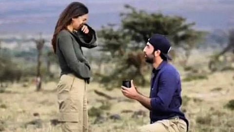 या फोटोमध्ये रणबीरने ब्लु शर्ट आणि खाकी पॅन्ट घातली आहे. तसेच रणबीर गुडघ्यांवर बसलेला दिसत आहे. त्याच्या दोन्ही हातात रिंगचा बॉक्स पकडला आहे. हा फोटो रणबीर आलिया यांनी शेअर केलेला नसून त्यांच्या एका फॅन पेजवर शेअर करण्यात आला आहे. या फोटोमध्ये त्या दोघांचे एकमेकांवरील प्रेम दिसून येत आहे. (Ranbir Kapoor)