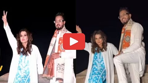 व्हायरल होणाऱ्या व्हिडीओमध्ये दिसत आहे की, राखी सावंत जेसीबीच्या पुढच्या भागामध्ये उभी आहे. तिने निळ्या रंगाचा कुर्ता आणि त्यावर पांढऱ्या रंगाची श्रग परिधान केली आहे. या ड्रेसिंगवर राखीने काळ्या रंगाचे शूज कॅरी केले आहेत. रस्त्यावरून हा जेसीबी चालत असून समोर बँडबाजावाले दिसत आहेत. राखी सावंतचा हा ड्रामा पाहून रस्त्यावरून जाणारे नागरिक देखील हसताना दिसत आहेत.