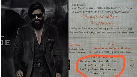 सुपरस्टार यशचा चित्रपट KGF-2 सध्या बॉक्स ऑफिसवर प्रचंड गाजला आहे. चित्रपटाबद्दल तसेच त्यातील डायलॉग्सबद्दल प्रेक्षकांच्या मनात खूप उत्साह आहे. सध्या चित्रपटातील यशचा एक डायलॉग चांगलाच गाजला आहे. तो म्हणजे - व्हायलेन्स, व्हायलेन्स, व्हायलेन्स.. मला ते आवडत नाही. मी ते टाळतो. पण हिंसेला मी आवडतो आणि मी ते टाळू शकत नाही. (“Violence..Violence..Violence! I don’t like it. I avoid, but, violence likes me!”) या कडक डायलॉगबद्दल सध्या सोशल मीडियावर खूप मिम्स बनत आहेत. यशचा हा डायलॉग एक भन्नाट अंदाजात समोर आला आहे. यशच्या एका फॅनने आपल्या लग्नपत्रिकेवर हा डायलॉग अनोख्या अंदाजात छापला असून लग्नपत्रिकेतील या ओळी खूप हास्यास्पद आहेत. (KGF 2 Dialogue On Wedding Card)