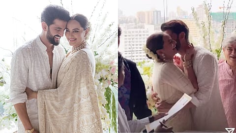 सोनाक्षी सिन्हा आणि झहीर इक्बाल यांच्या लग्नाच्या चर्चा गेल्या काही दिवसांपासून रंगल्या होत्या. अखेर त्यांनी काल रजिस्टर पद्धतीने लग्नबंधनात अडकले आहे. या कपलचे लग्नानंतरचे अनेक फोटो आणि व्हिडीओ सध्या सोशल मीडियावर व्हायरल होत आहे. व्हायरल होत असलेल्या व्हिडीओमध्ये सोनाक्षी आणि झहीरच्या कुटुंबियांची झलक पाहायला मिळत आहे. रजिस्टर पद्धतीने लग्न केल्यानंतर झहीरने सोनाक्षीला सर्वांसमोर किस केलं आहे. सध्या हा व्हिडीओ इन्स्टाग्रामवर तुफान व्हायरल होत आहे.