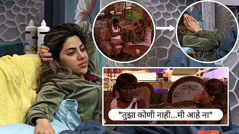 'बिग बॉस मराठी'च्या आजच्या भागात,"सूरज निक्कीला दिलासा देत म्हणतोय,"तुझा कोणी नाही...मी आहे ना". त्यावर निक्की म्हणतेय,"तू आहेस ना. तुझ्यासोबत गप्पा मारायला बसेल मी". सूरज त्यावर म्हणतोय,"आपलं कुटुंब आहे, घर आपलं आहे. आता रडायचं नाही...स्ट्राँग व्हायचं". निक्की सूरजला उत्तर देत म्हणतेय,"स्ट्राँग तर आहेच...पण दु:खी झाले आहे".