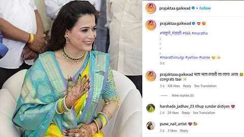 प्राजक्ताने शेअर केलेल्या या फोटोमध्ये तिने पिवळ्या रंगाची निळी बॉर्डर असलेली साडी परिधान केली आहे. खाद्यांवर पदर घेत अभिनेत्री एखाद्या नवरीसारखीच बसलेली दिसत आहे. केसात गजरा, हातावर मेहंदी देखील प्राजक्ताने काढली आहे. प्राजक्ताच्या आजूबाजूला पाहुणी मंडळी दिसत आहे. सोशल मीडियावर प्राजक्ताच्या फोटोवर चाहत्यांनी कमेट्सचा वर्षाव केला आहे. तिच्या एका चाहत्याने तिचं ठरलं की काय असा प्रश्न चाहत्यांना पडला आहे तर आणखी एकाने,
