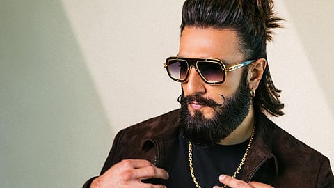 रणवीर सिंगने केसाची पोनी, ब्लॅक गॉगल, गळ्यात सोन्याची चैन, कानातले, पिळदार मिश्या असा लूक केला आहे.