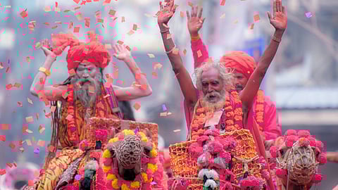 श्री तपोनिधी आनंद आखाडा पंचायतीचे प्रयागराज 'नागा साधू' सोमवार, 6 जानेवारी 2025 रोजी प्रयागराज येथे महा कुंभ मेळा 2025 च्या आधी संगमकडे निघालेल्या मिरवणुकीत भाग घेतात.