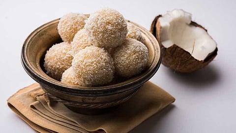 सर्व साहित्य थंड झाल्यानंतर हातात घेऊन मध्यम आकाराचे लाडू बनवा. प्रसादासाठी नारळाचे लाडू तयार.