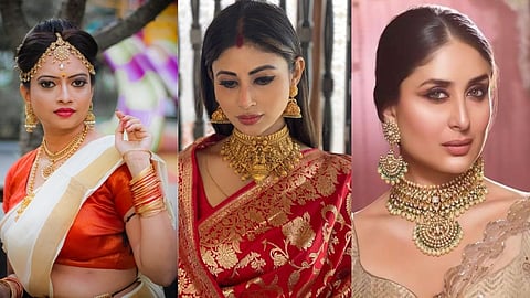 १. हल्ली बाजारात नवनवीन ट्रेंडनुसार ज्वेलरी मिळतात. जर आपण बनारसी साडी नेसत असू तर त्यावर मंदिर शैलीतील नेकलेसपासून ते कानातल्यांपर्यंत कोणताही लूक छान दिसेल. कौटुंबिक समारंभ किंवा लग्न (Wedding) समारंभासाठी बनारसी साडीसोबत आपण सोन्याचे (Gold) टोन्ड जडौ मंदिरातील दागिने सहज कॅरी करू शकतो.