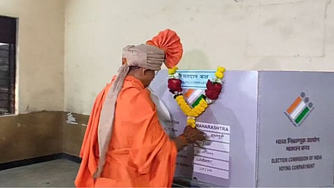 ठाणे, कल्याण, नाशिकसह राज्यातील १३ जागांसाठी लोकसभा निवडणुकांच्या पाचव्या टप्प्यात मतदान होत आहे. सकाळपासून सर्व मतदान केंद्रांवर मतदार गर्दी करताना दिसत आहे. अशातच नाशिक लोकसभेचे उमेदवार शांतीगिरी महाराज यांनी ईव्हीएम मशिनची हार घालून पूजा केल्याचा प्रकार समोर आला होता. याप्रकरणी पोलिसांनी कडक कारवाई करत शांतीगिरी महाराजांसह ४ जणांवर गुन्हा दाखल केला आहे.