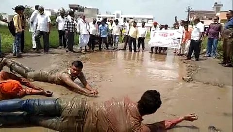 परभणी - एकीकडे आज मराठवाडा Marathwada मुक्ती संग्राम दिवस साजरा करत आहे, तर दुसरीकडे परभणी Parbhani शहरात रस्ते नसल्याने प्रहार संघटनेचे कार्यकर्ते परभणी मनपाच्या विरोधात चिखलात लोटांगण आंदोलन करत आहे. परभणी शहर महानगर पालिका हद्दीतील जुना पेडगाव Pedgaon रोड ते उघडा महादेव मंदिर रोड वरील रस्त्याचे काम अनेक वर्षांपासून झाले नाही. या रस्त्यावर मोठ्या प्रमाणात रहदारी असून रस्त्यावरून चालण्यासाठी देखील नागरिकांना मोठी कसरत करावी लागते.