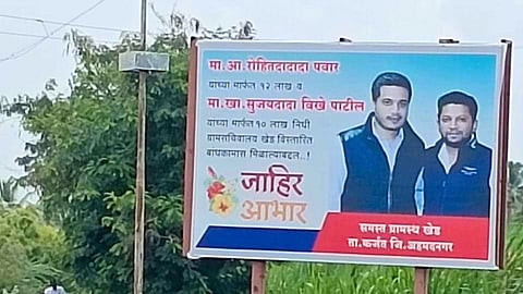 अहमदनगर (Ahmednagar) जिल्ह्याच्या राजकारणात विखे आणि पवार या घराण्यांचं शत्रुत्व राजकारणाच्या माध्यमातून नेहमीच समोर येत असतं. सुजय विखे पाटील हे भाजपकडून खासदार झाल्यानंतर त्यांनी जामखेड मतदारसंघात येऊन रोहित पवार यांच्यावर टीका केली होती. रोहित पवारही वेळोवेळी भाजपवर निशाणा साधत असताना खासदार या नात्याने सुजय विखे पाटील यांच्यावर टीका करत असतात. मात्र या राजकीय टीकाटिप्पणीमध्ये सध्या कर्जत तालुक्यातील खेड या गावात एक फलक सर्वांचे लक्ष वेधून घेत आहे.