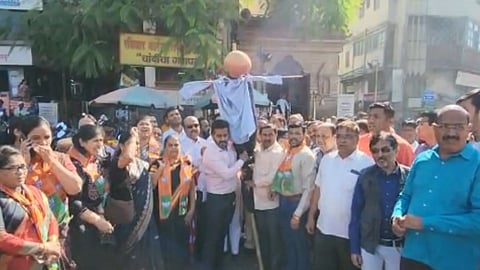नाशिक जिल्ह्यात भाजपाने कारंजा इथं अजित पवार यांच्या विधानाचा निषेध नाेंदविला. यावेळी आंदाेलकांनी अजित पवार यांच्या प्रतिकात्मक पुतळ्याचे दहन केले. त्यानंतर जाेरदार घाेषणा देत अजित पवारांचा निषेध करण्यात आला.