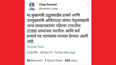 औरंगाबाद : राज्यातील प्राध्यापक, प्राचार्य पदासाठी पात्र असलेल्या आणि प्राध्यापक भरतीची आतुरतेने वाट पाहणाऱ्यांसाठी एक महत्त्वाचं पाऊल राज्य सरकारच्या वतीनं पडलंय. राज्यातील प्राध्यापक आणि प्राचार्य भरतीबाबत उच्च व तंत्रशिक्षण मंत्री उदय सामंत यांनी एक ट्विट करून महत्त्वाची माहिती दिली. त्या ट्वीटमध्ये 'मुख्यमंत्री उद्धव ठाकरे आणि उपमुख्यमंत्री अजित पवार यांच्या नेतृत्वाखाली प्राध्यापकांच्या पहिल्या टप्यातील २ हजार ८८ प्राध्यापक भरतीला आणि सर्व प्राचार्य पद भरण्याला मान्यता देण्यात आली आहे.' असा मजकूर टाकलाय.