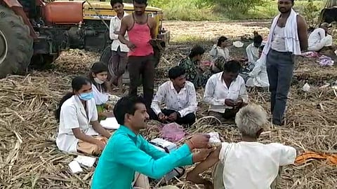 बीड : बीडच्या गेवराई तालुक्यातील गोळेगाव परिसरात, ऊसाच्या फडात काम करणाऱ्या मजुरांचे, फडात जाऊन कोविड लसीकरण सुरू केले आहे. कोरोना रुग्णांची संख्या कमी अधिक होत असल्याने, डॉ. वसंत पवार यांनी प्रत्येक गावात जाऊन लसिकरण मोहीम सुरु केली आहे. गेवराई तालुक्यातील गोळेगांव येथील शेतात जाऊन, डॉ. वसंत पवार, डॉ. वृषालीताई , डॉ. गुळे मॅडम, अनिल काळे यांच्यासह आशा कार्यकर्त्यां अन् अंगणवाडीताई यांनी या लसीकरण मोहिमेला सुरुवात केली आहे.
