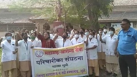 अहमदनगर येथील रुग्णालयामध्ये आग लागून रुग्णांचा मृत्यू झाल्याची घटना उघडकीस आली होती. त्यानंतर संबंधित प्रशासनाने या ठिकाणी कार्यरत असलेल्या परिचारिका व डॉक्टरांवर या दुर्घटनेचा दोष लावत त्यांच्यावर सदोष मनुष्यवधाचा गुन्हा दाखल करीत त्यांचे निलंबन केले. या घटनेचा निषेध करण्यासाठी धुळ्यातील परिचरिकांनी तीन दिवसांपासून काळ्या फिती लावून प्रशासनाचा निषेध केला. परंतु त्यानंतरही प्रशासनातर्फे कुठल्याही प्रकारची दखल घेण्यात आली नाही, म्हणून आज संपूर्ण दिवस संपाचे हत्यार धुळ्यातील परिचारिकांनी उगारले आहे.