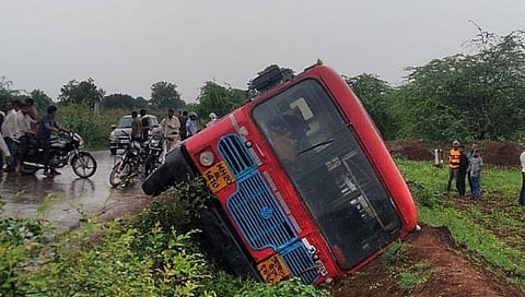 धुळे : मुसळधार पावसाने राज्यात हाहाकार माजवला असताना धुळे जिल्ह्यात रिमझिम पाऊस होत आहे. यामुळे देखील रस्त्यांची समस्या होत आहे. यात वालखेडा गावाजवळ रस्त्याच्या कडेवरची जमिन खचल्याने प्रवाशांनी भरलेली बस उलटली. सुदैवाने यात हानी झाली नाही. (dhule-news-rain-droped-and-road-crash-bus-accident)