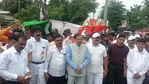धुळे : स्वातंत्र्याच्या सुवर्ण महोत्सवी वर्षानिमित्त धुळे शहरातून आज भव्य तिरंगा रॅलीचे आयोजन करण्यात आले होते. या तिरंगा रॅली दरम्यान 1 हजार 111 फुट लांबीचा तिरंगा झेंडा खांद्यावर घेऊन धुळे (Dhule) शहरातून या भव्य रॅलीला सुरुवात करण्यात आली. (Dhule News Indian Flag)