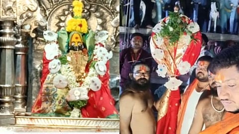 तुळजापूर - तब्बल दोन वर्षांनंतर तुळजाभवानी मंदिरात गुढीपाडवा भक्तांसोबत साजरा करण्यात आला. मंदिराच्या मुख्य कळसाखाली आज पहाटेच्या सुमारास गुढी उभारण्यात आली. त्यानंतर देवीचा अभिषेक करण्यात आला. मूर्तीला सर्वोत्कृष्ट शिवकालीन दागिन्यांचा पेहराव घालण्यात आला. मंदिरात पारंपरिक पद्धतीने, विविध कार्यक्रमांनी गुढीपाडवा साजरा करण्यात येतो.